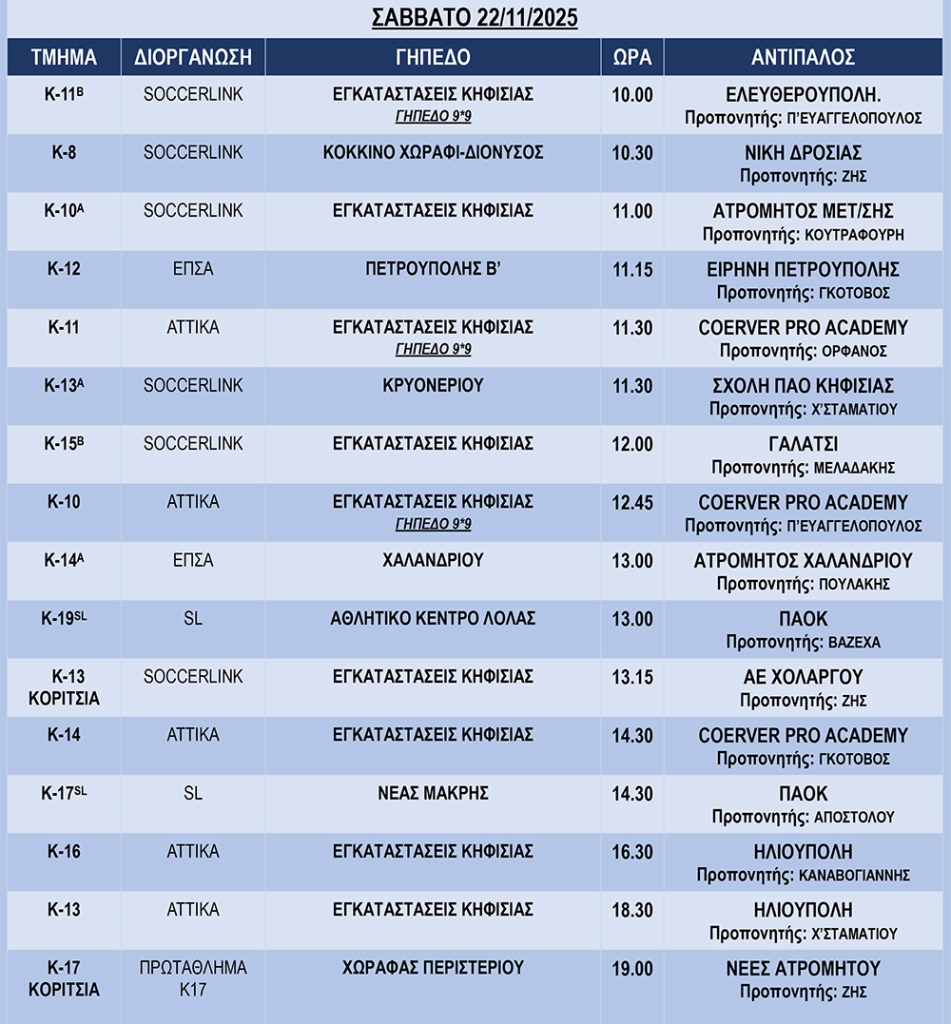 To αγωνιστικό πρόγραμμα της Ακαδημίας μας για το Σαβ/κύριακο 22-23/11/25 και Τετάρτη 26/11/25.