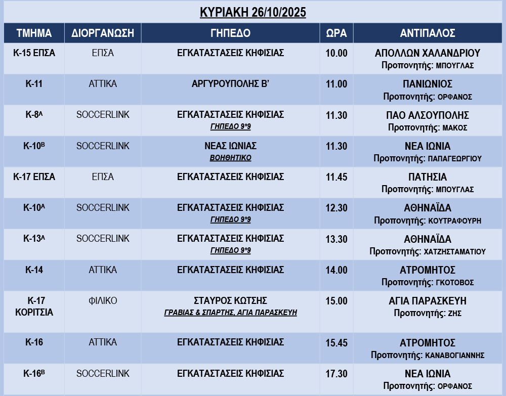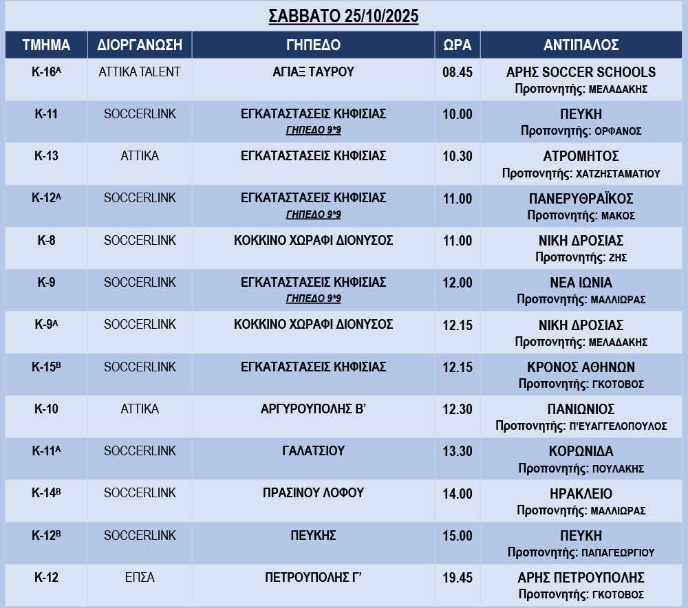 To αγωνιστικό πρόγραμμα της Ακαδημίας μας για το Σαβ/κύριακο 25-26/10/2025.
