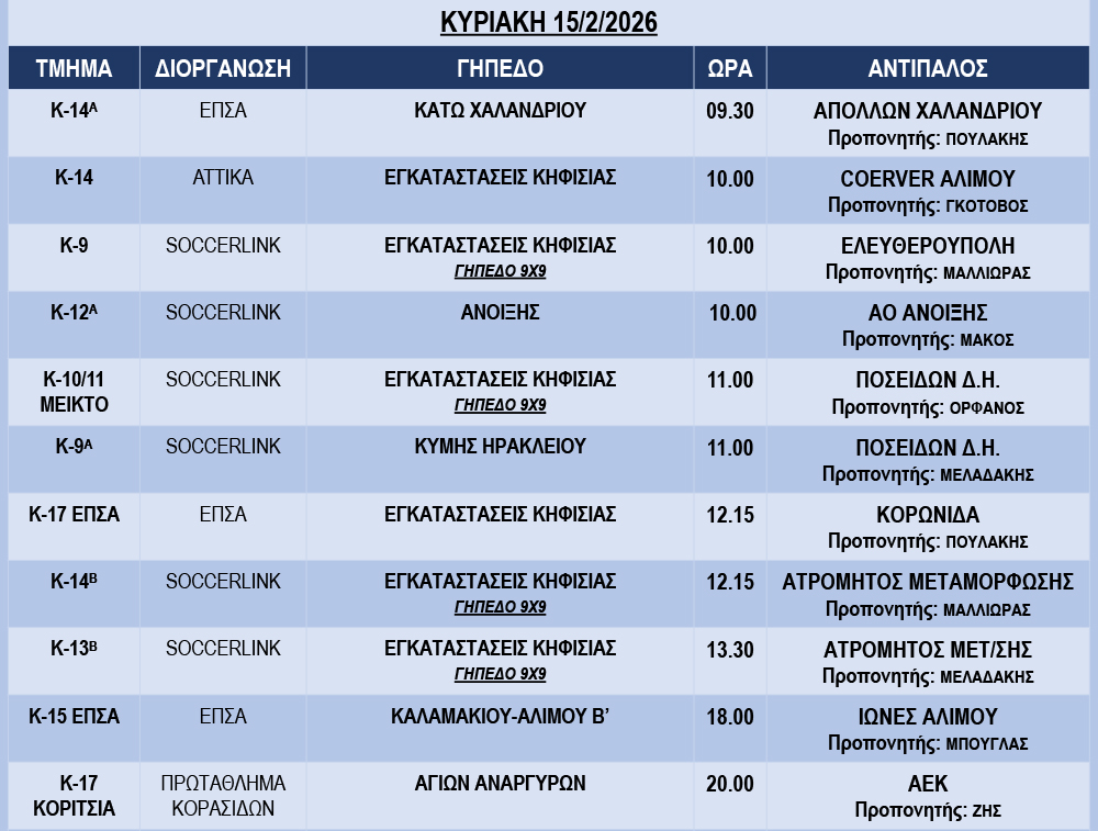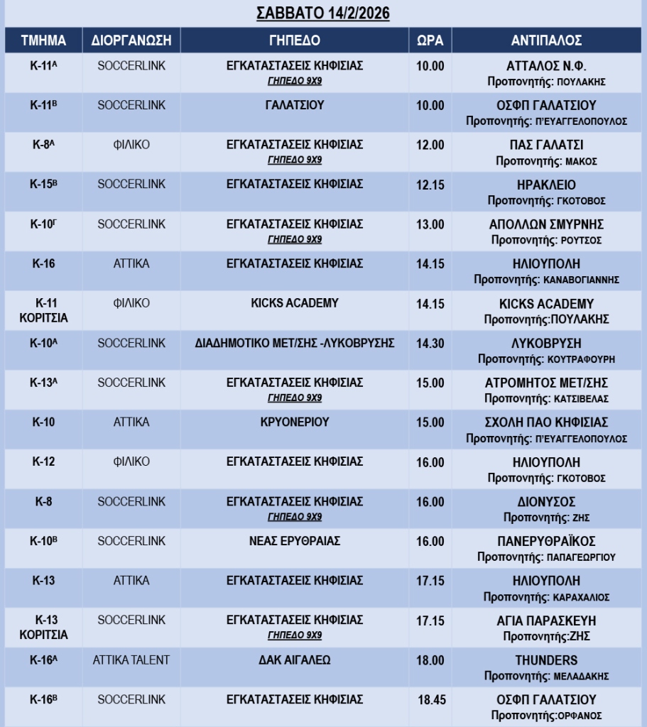To αγωνιστικό πρόγραμμα της Ακαδημίας μας για το Σαβ/κύριακο 14-15/02/26.